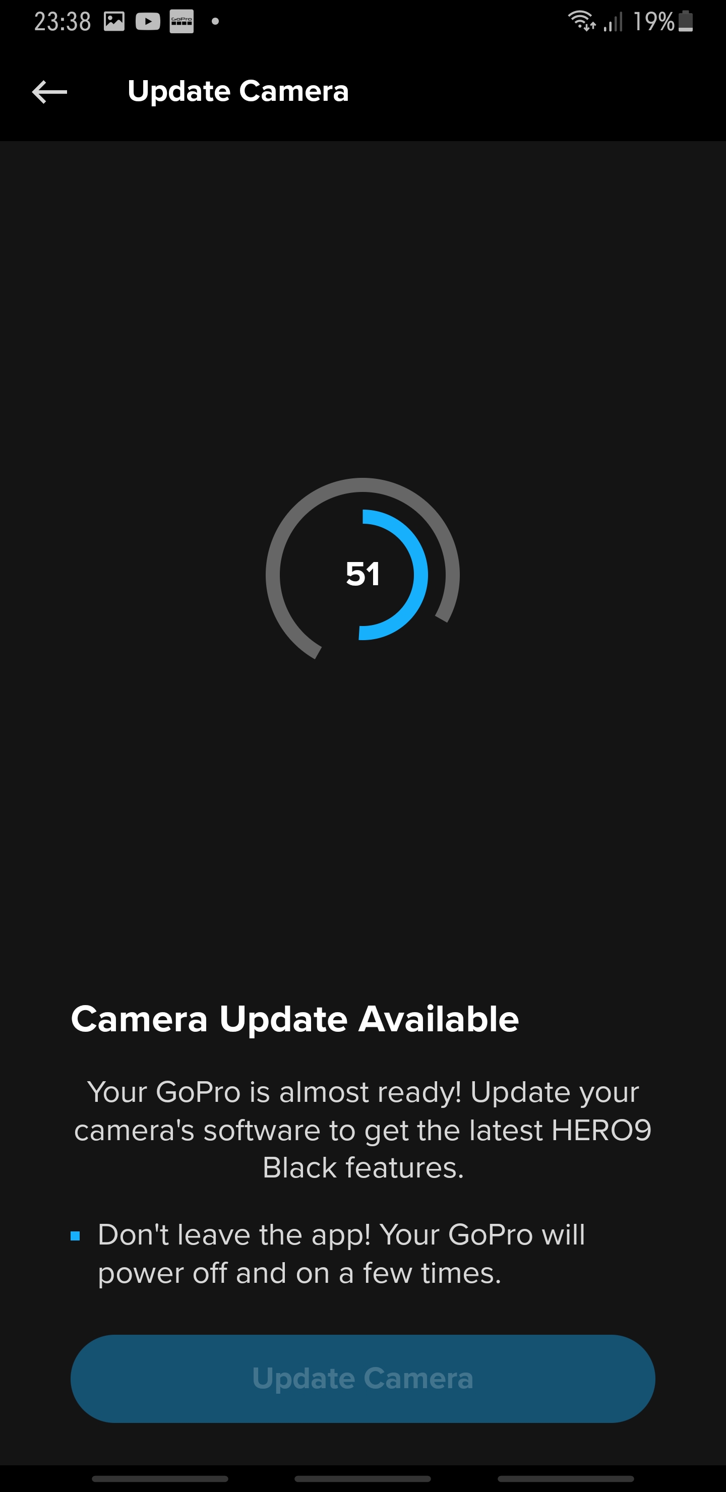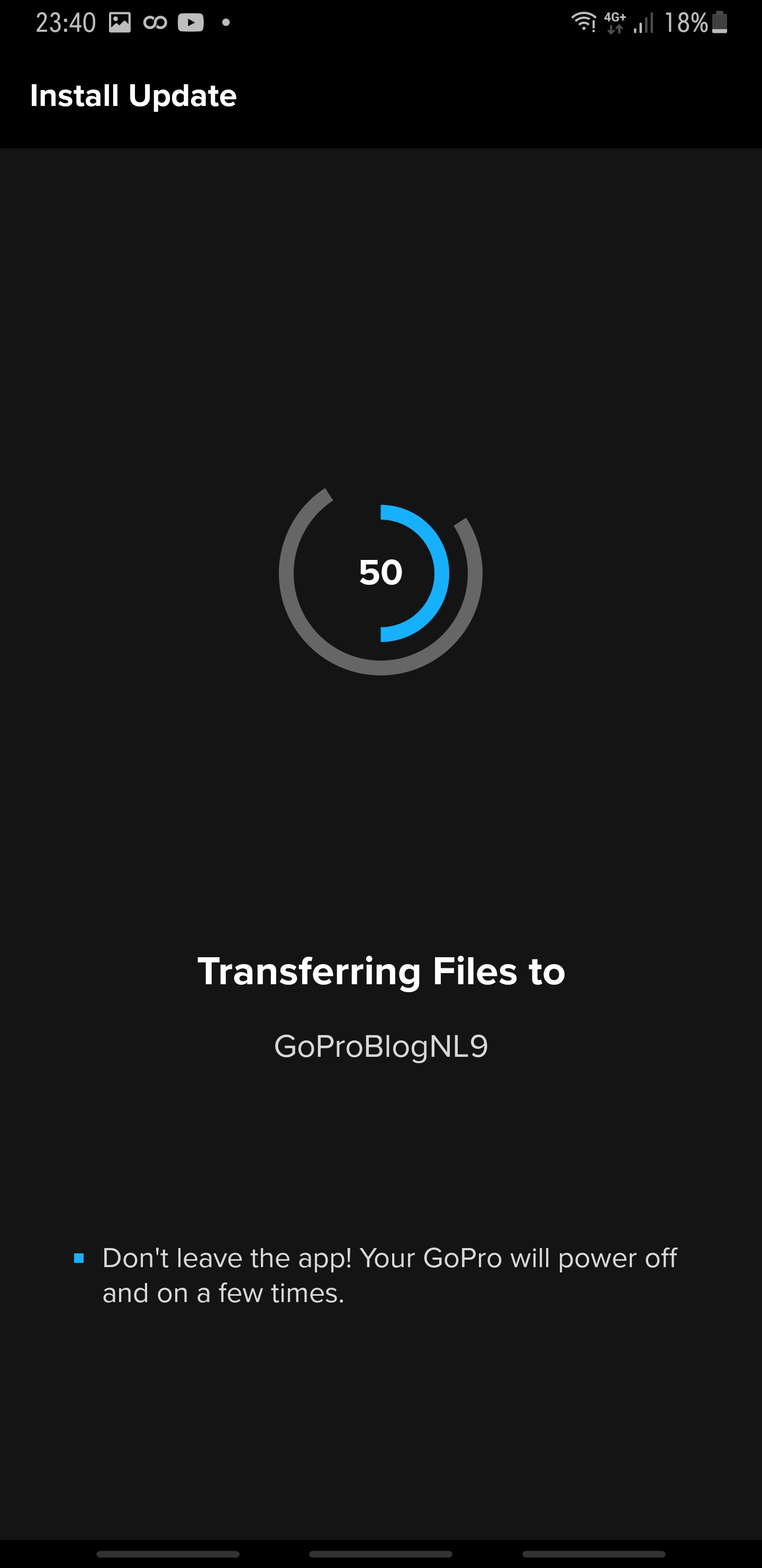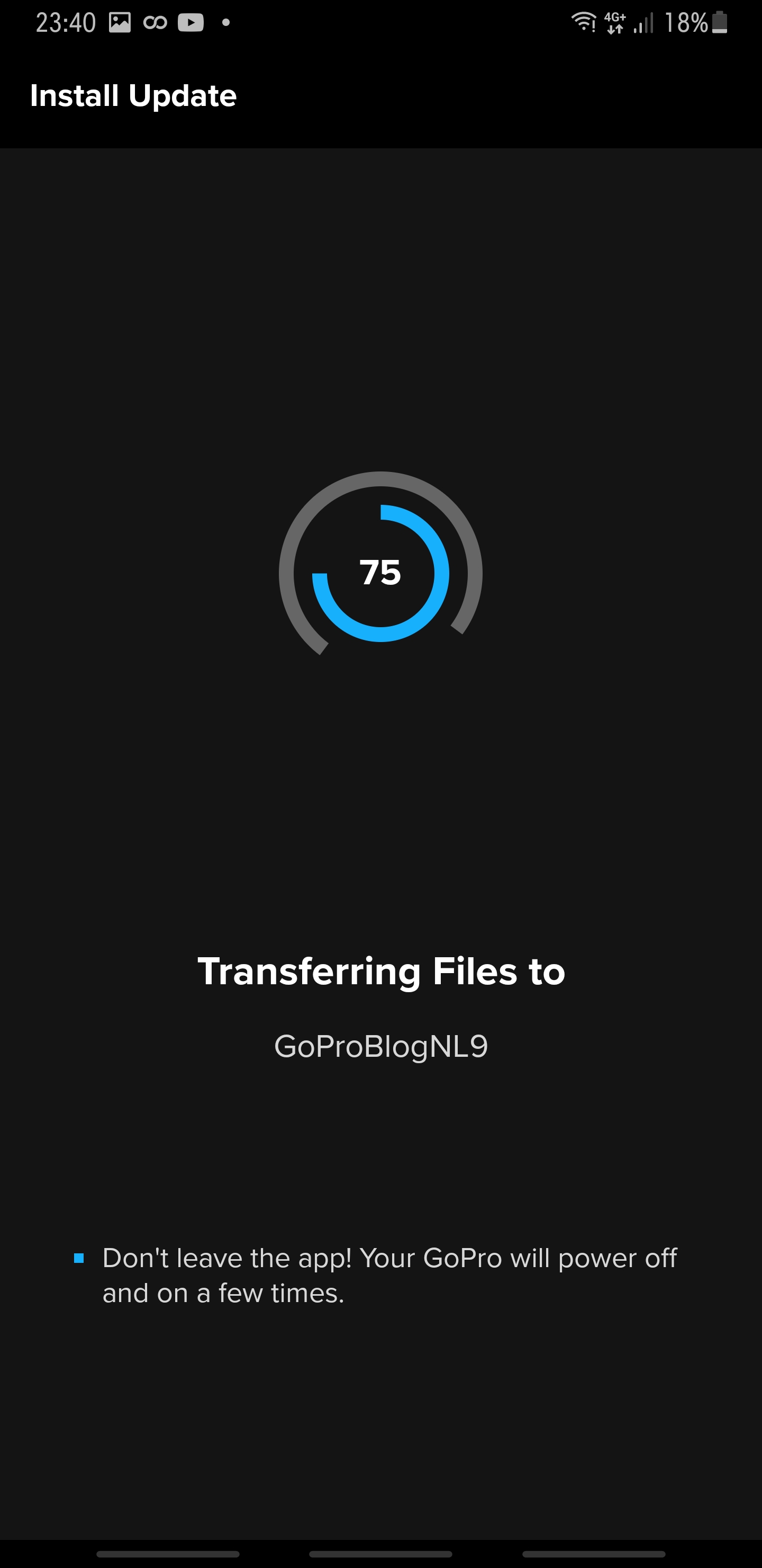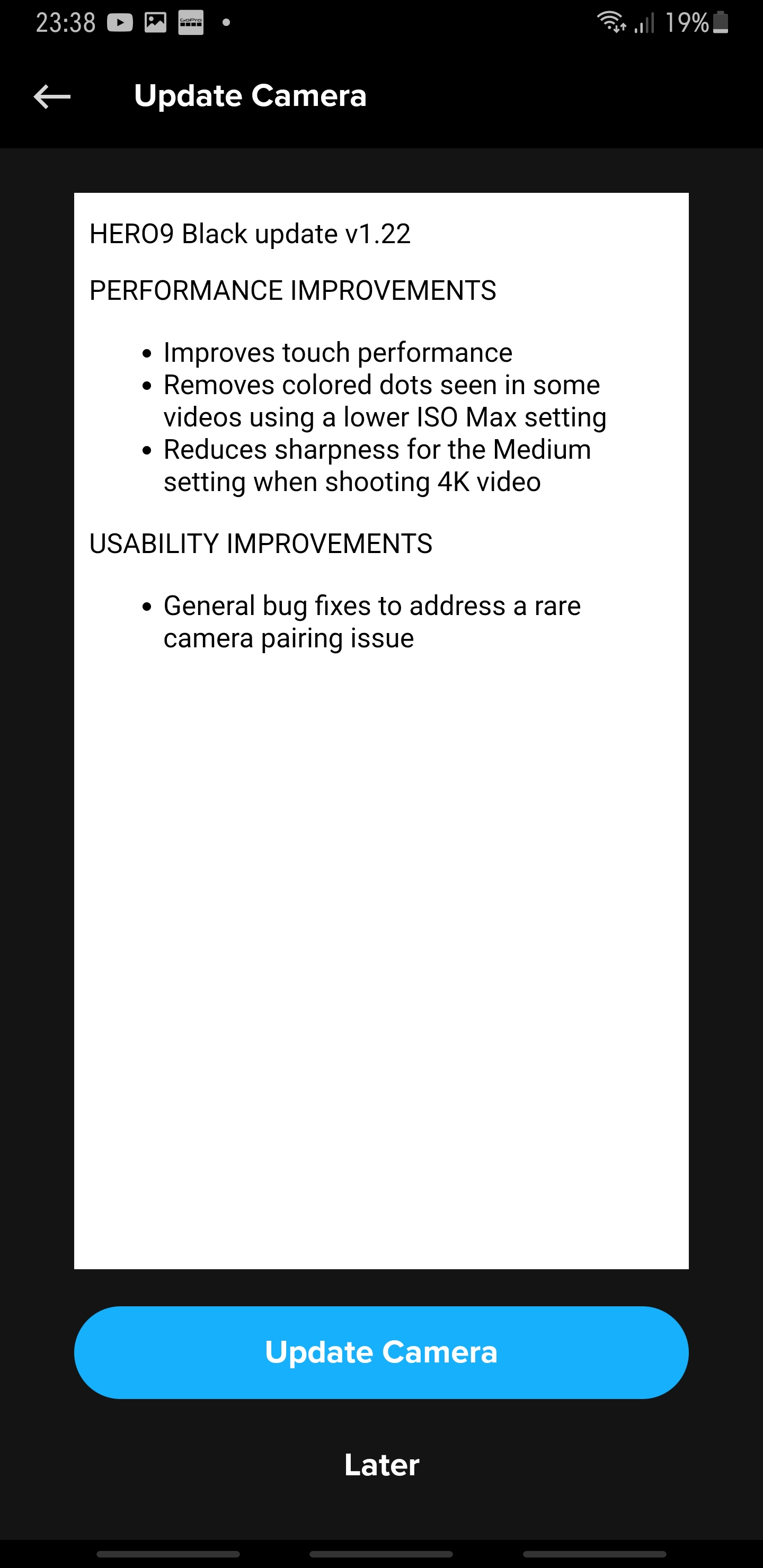 Deze HERO9 Black update brengt veel verbeteringen met zich mee waaronder betere gevoeligheid van het touchscreen en minder scherpte bij de medium keuze van 4K. Hoogtepunten Prestatieverbeteringen Verbetert de aanraakprestaties. Verwijdert gekleurde stippen die in sommige video's te zien zijn met behulp van een lagere ISO Max instelling. Vermindert de scherpte voor de instelling Medium bij het opnemen van 4K video. Gebruikersverbeteringen Algemene bugfixes om een zeldzaam probleem met camera's aan te pakken. Doe de update naar v1.22 alleen met een originele GoPro HERO9 Black Batterij anders bestaat de kans dat je je HERO9 Black bricked. Hoe update je je GoPro HERO9 Black? Dat is heel eenvoudig, als je de GoPro app gebruikt dan geeft deze al zelf aan dat er een update is. Zorg er voor dat als je de update gaat doen dat je GoPro en smart device accu's vol zijn.